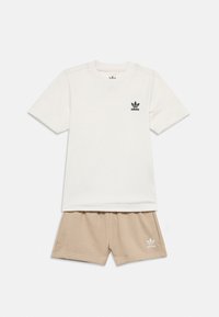 Čierny bavlnený set pozostávajúci z trička a šortiek s malým bielym logom Adidas na hrudi a leme, krátkymi rukávmi a klasickým strihom.