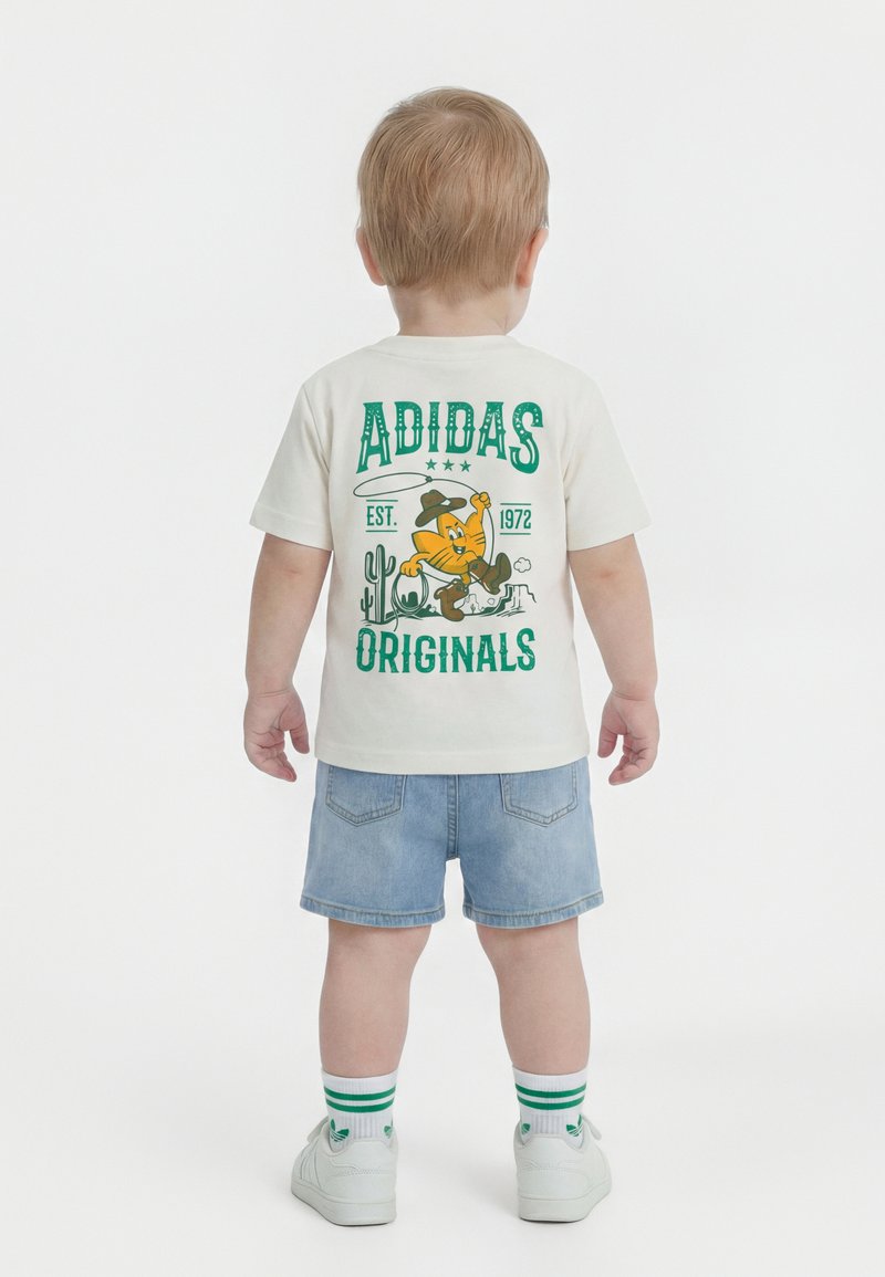 Batole otočené chrbtom, oblečené do bieleho trička Adidas s kovbojským kresleným motívom, rifľových šortiek, bielych tenisiek a pruhovaných ponožiek.
