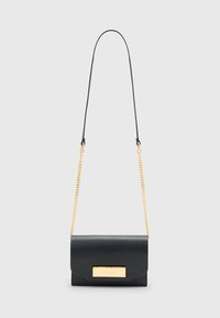 Čierna kožená crossbody kabelka s klopou na zatváranie, zlatým reťazovým remienkom a obdĺžnikovou kovovou platničkou.