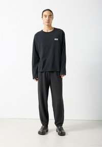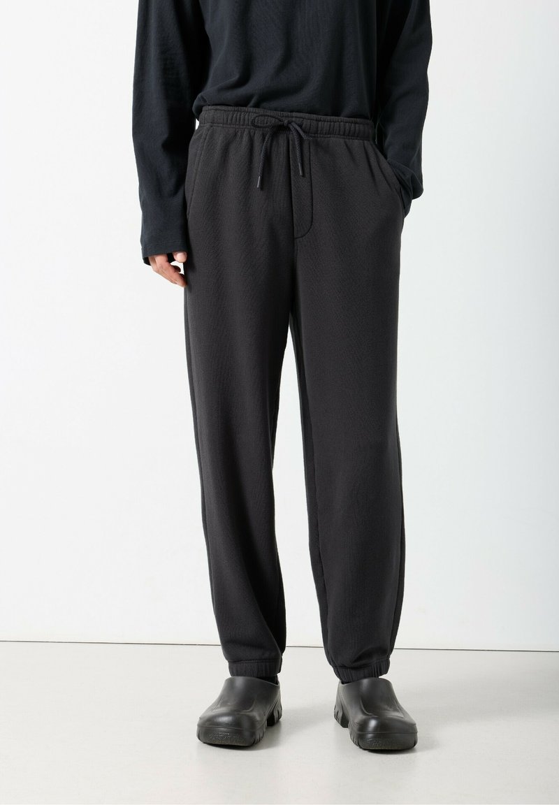 Čierne voľné teplákové nohavice s elastickým pásom a šnúrkou na stiahnutie. Textúrovaná tkanina, ukončené manžetami na členkoch, doplnené o čiernu obuv na zavliekanie.