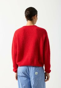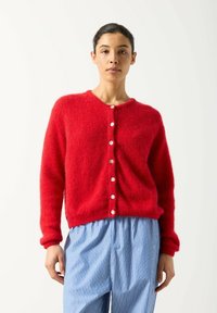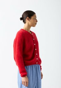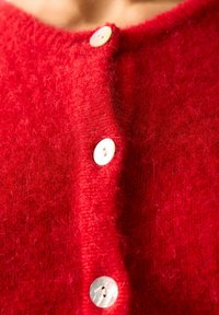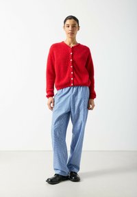 Žena v jasne červenom plyšovom svetri na zapínanie a vo voľných modro-bielych pruhovaných nohaviciach na jednoduchom svetlom pozadí.
