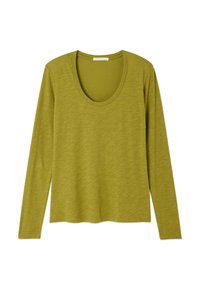 Olivovo zelené tričko s dlhým rukávom vyrobené z jemnej, textúrovanej tkaniny so širokým výstrihom, priliehavými rukávmi a voľnejším strihom v spodnej časti.