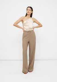 Žena nosi svetlohnedé široké nohavice s elastickým pásom a sťahovacou šnúrkou, v kombinácii so sandálmi s otvorenou špičkou, na neutrálnom pozadí.