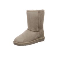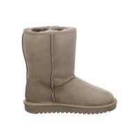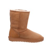 Stredne vysoká zimná čižma z hnedej semišovej kože s kožušinovou podšívkou a hrubou gumovou podrážkou s vroubkovaným vzorom pre lepšiu trakciu.