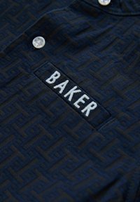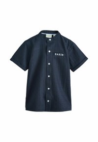 Tmavomodrá košeľa s krátkym rukávom a gombíkmi, so štruktúrovaným vzorom, stojačikovým golierom a vyšívaným nápisom "BAKER" na ľavom náprsnom vrecku.