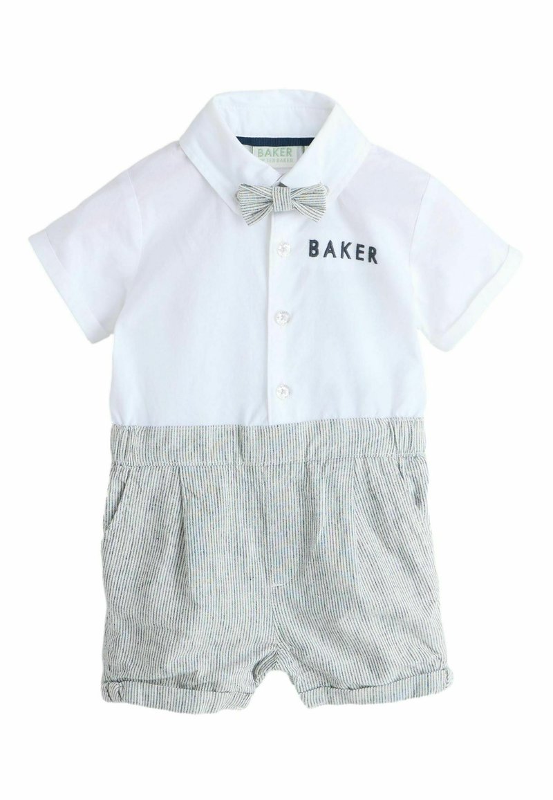 Biely overal s golierom a krátkymi rukávmi, ozdobený motýlikom, vyšívaným nápisom "BAKER" a pruhovanými šortkami v modrých a bielych tónoch.