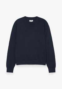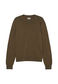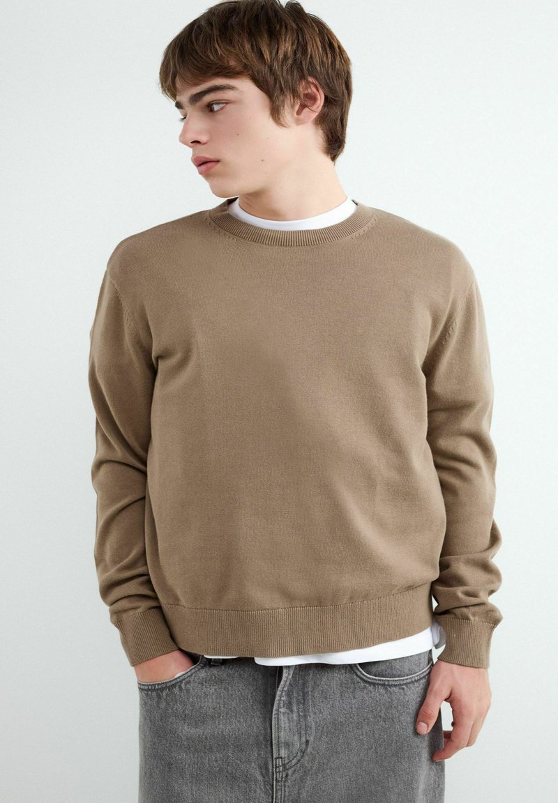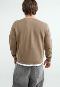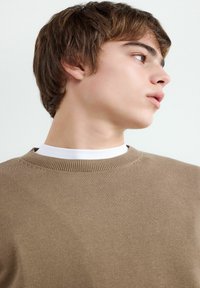 Mladý muž nosiaci béžový sveter cez bielu košeľu a sivé rifle, pozerá sa bokom s jednou rukou v vrecku na jednotnom pozadí.