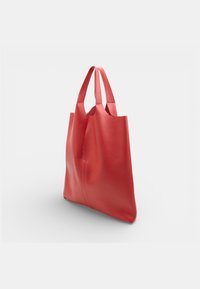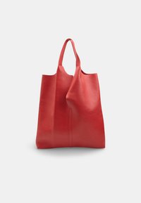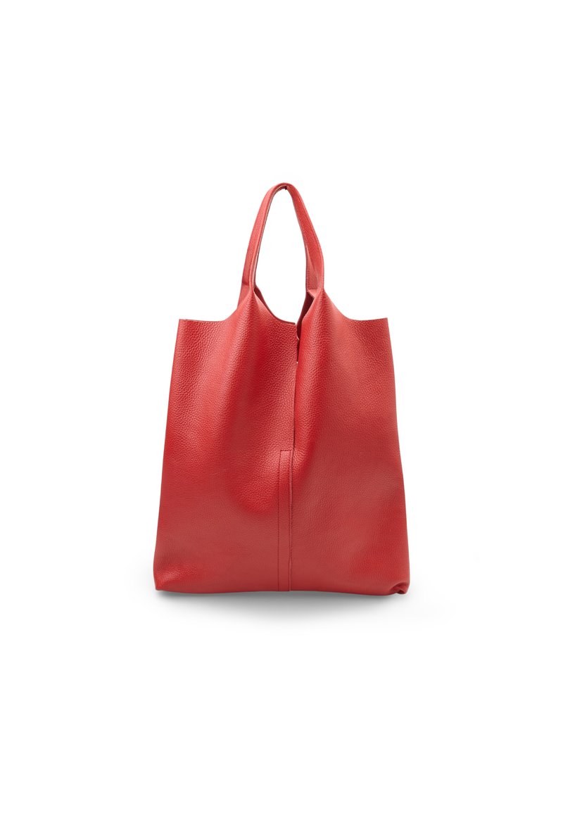 Červená kožená kabelka s dvoma rukoväťami, hladkou textúrou a jednoduchým vertikálnym švom v strede.