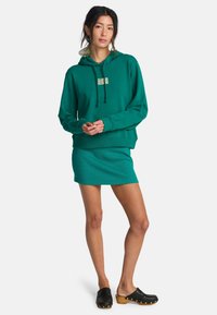 Mladá žena s tmavými vlasmi má na sebe tyrkysovú mikinu s kapucňou a sťahovacou šnúrkou a zladenú textúrovanú sukňu, na pozadí bielej steny.