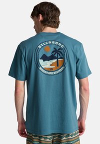 Muž v tyrkysovom tričku Billabong s kruhovým plážovým logom zobrazujúcim palmou, slnko a hory, v kombinácii s nohavicami s potlačou.
