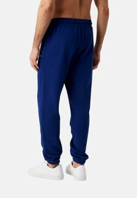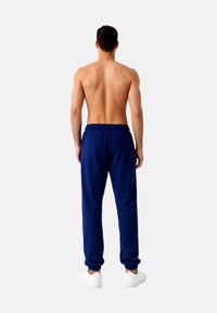 Muž oblečený v tmavomodrých teplákoch so šnúrkou a bielych teniskách, stojaci pred jednoduchým svetlým pozadím.