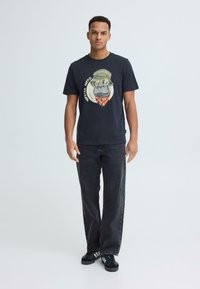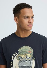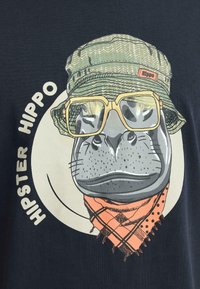 Mladý muž v čiernom tričku s grafikou hipopotáma v vedierkovej čiapke, slnečných okuliaroch a šatke, označeného ako „Hipster Hippo“, stojaci na bielom pozadí.