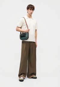Mladý muž nosiaci textúrované biele polo tričko s krátkym rukávom, široké hnedé nohavice, drží zeleno-čiernu tašku cez rameno s hnedým pásikom.