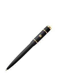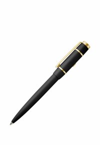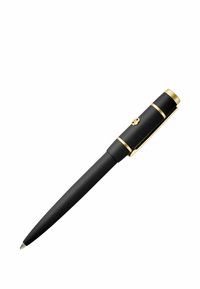 Čierne guľôčkové pero so zlatým klipom a detailmi, so zatvoreným uzáverom, izolované na bielom pozadí.