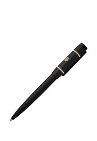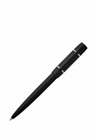Čierne guľôčkové pero so zlatým lemovaním a klipom, zobrazené na bielom pozadí.