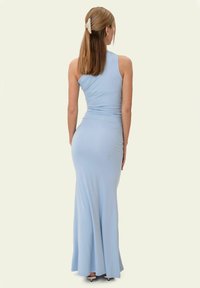 Žena v svetlomodrých, jednoramených, dlhých priliehavých šatoch stojaca na jednoduchom svetlom pozadí.