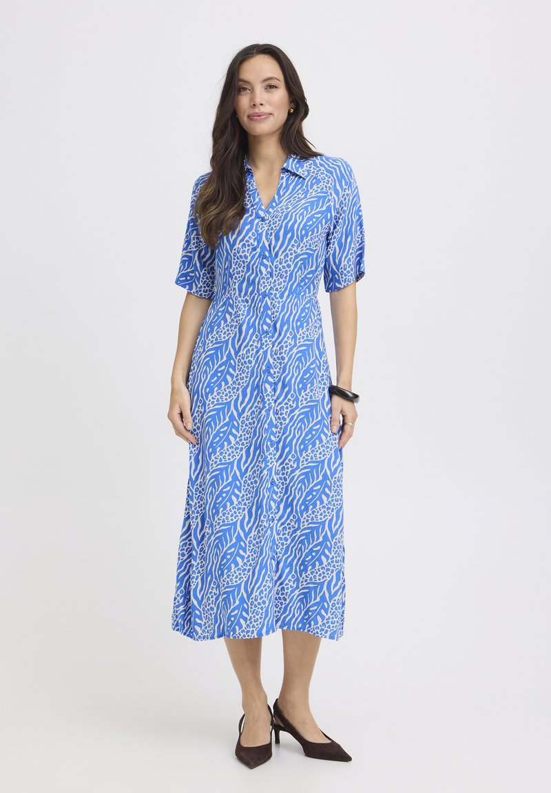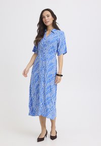 Žena v modro-bielych vzorovaných midi šatách s krátkymi rukávmi stojaca na svetlom jednoduchom pozadí, obutá v čiernych lodičkách.
