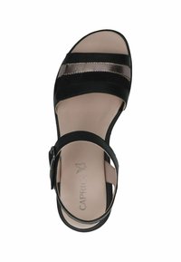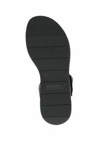 Čierna kožená sandála s kovovými prúžkami, nastaviteľným pásikom okolo členka, mäkkou béžovou vnútornou stielkou a textúrovanou čiernou gumovou podrážkou.