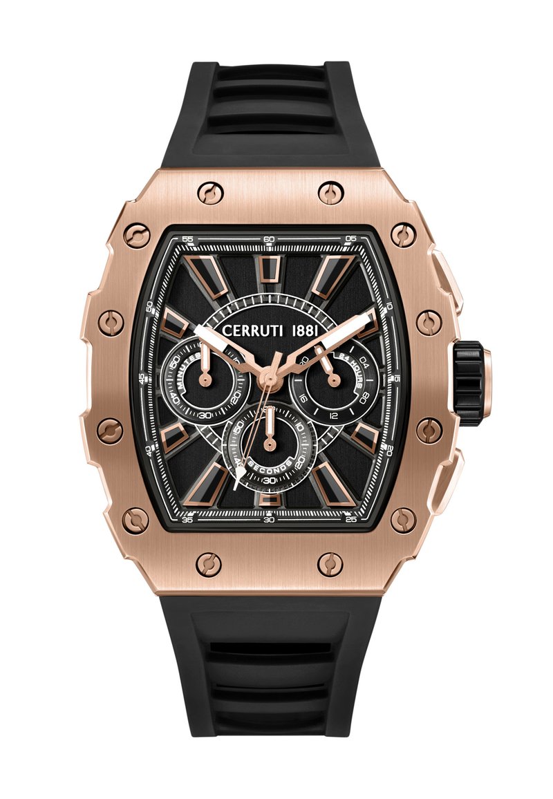 Obdĺžnikové hodinky z ružového zlata s čiernym ciferníkom, tromi pomocnými ciferníkmi, geometrickými hodinovými značkami, čiernym gumovým remienkom a značkou "Cerruti 1881".