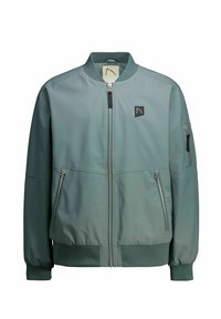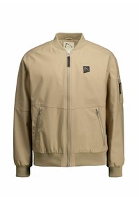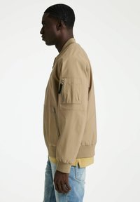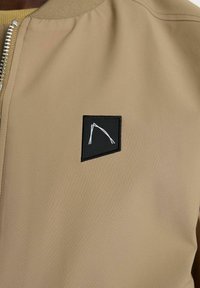 Béžová bomber bunda s predným zipsom, bočnými vreckami a rebrovanými manžetami. Na hrudi má malé čierne logo a na rukáve vrecko so zipsom.