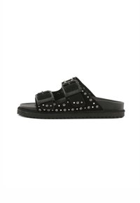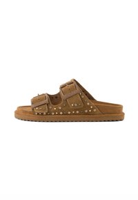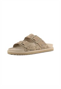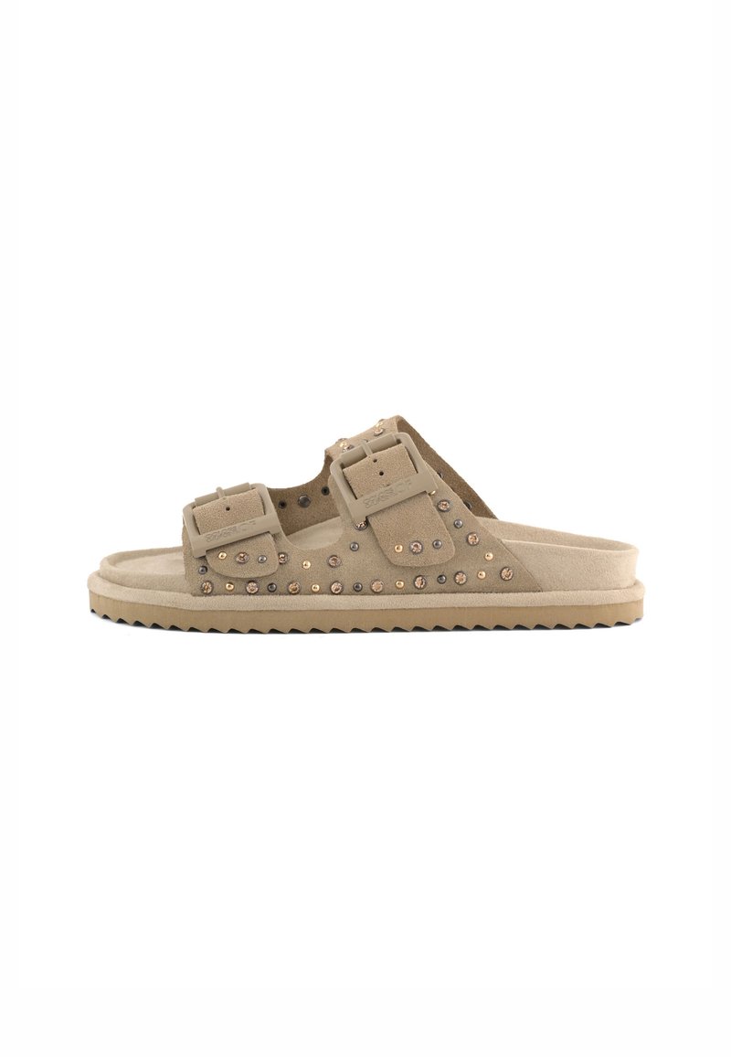 Béžová semišová šľapka s dvoma nastaviteľnými prackami a dekoratívnymi okrúhlymi cvočkami na vrchu a drážkovanou podrážkou.