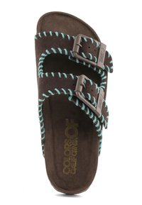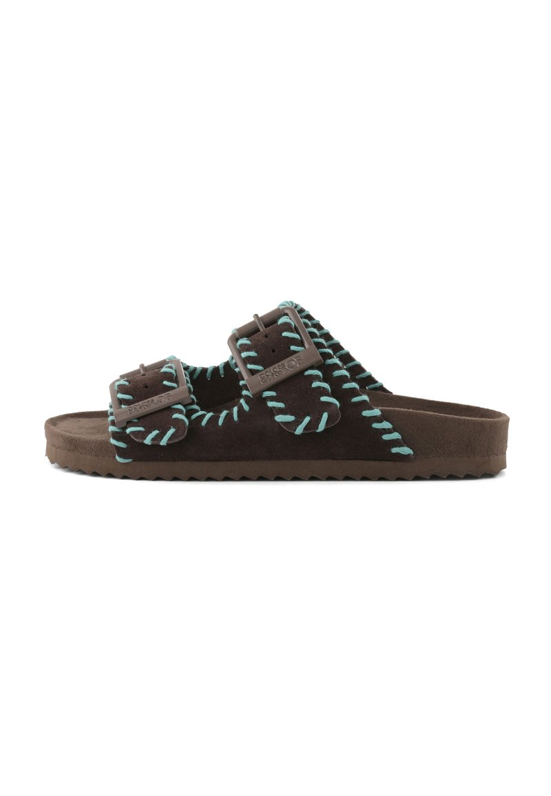 Hnedá semišová nazúvacia sandála s dvoma nastaviteľnými prackami a tyrkysovým ozdobným prešitím na bielom pozadí.