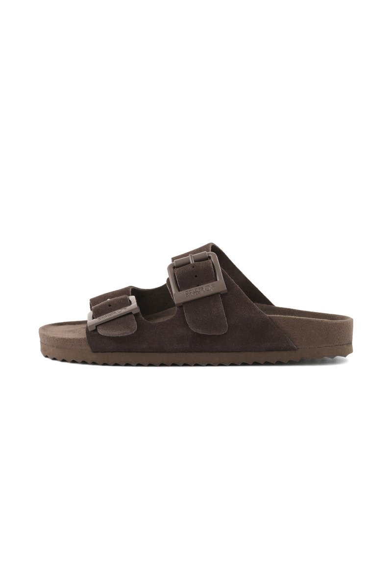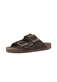 Hnedá semišová šmykľavá sandála s dvoma nastaviteľnými remienkami so sponami a rebrovanou podrážkou.