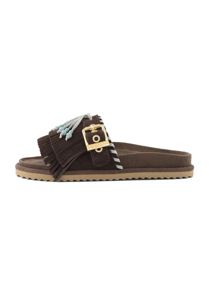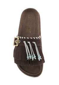 Hnedá semišová šľapka s pruhmi, modrými korálikovými strapcami, zlatou prackou a drážkovanou gumovou podrážkou.