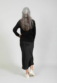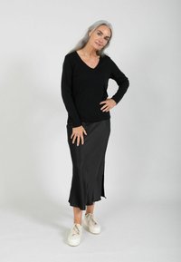 Čierne tričko s dlhým rukávom a výstrihom do V z mäkkej tkaniny, v kombinácii s tmavou sukňou, s voľným strihom a hladkou textúrou.