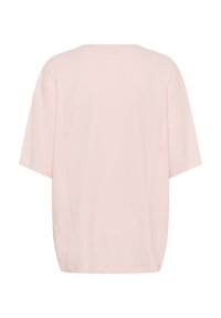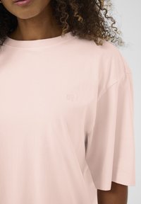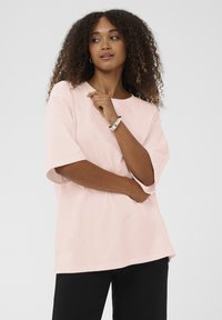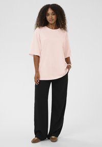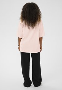 Žena s kučeravými vlasmi, oblečená v svetloružovom oversize tričku a čiernych nohaviciach, stojaca so založenou jednou rukou a pozerajúca sa do strany.