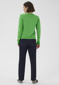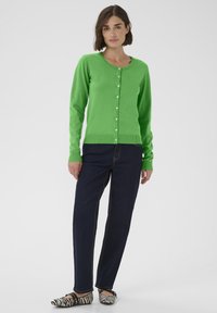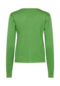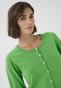Zelený pletený kardigán s okrúhlym výstrihom, dlhými rukávmi a zapínaním na gombíky vpredu. Má rebrované manžety a lem, vyrobený z mäkkého materiálu.