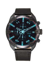 Osoba nosiaca čierny rolák so čiernymi hodinkami s veľkým modro-červeným ciferníkom na ľavom zápästí.