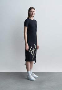 Žena stojaca, oblečená v čiernych midi šatách s krátkym rukávom s nápisom „EA7 Emporio Armani“, doplnených bielymi teniskami a ponožkami.
