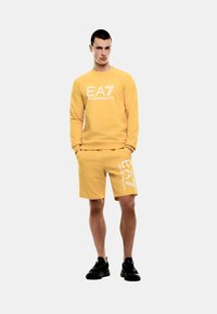 Muž nosiaci žlté šortky so sťahovacou šnúrkou a bielym logom „EA Emporio Armani“ na pravej stehnovej časti a čierne športové topánky.