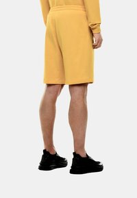 Žlté bavlnené šortky s elastickým pásom a nastaviteľnou šnúrkou. Biele šitie detaily a bočné švy. Nosené s bielymi teniskami.