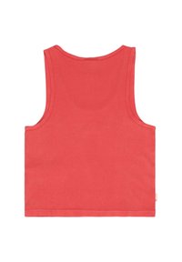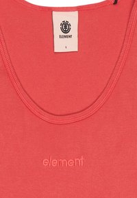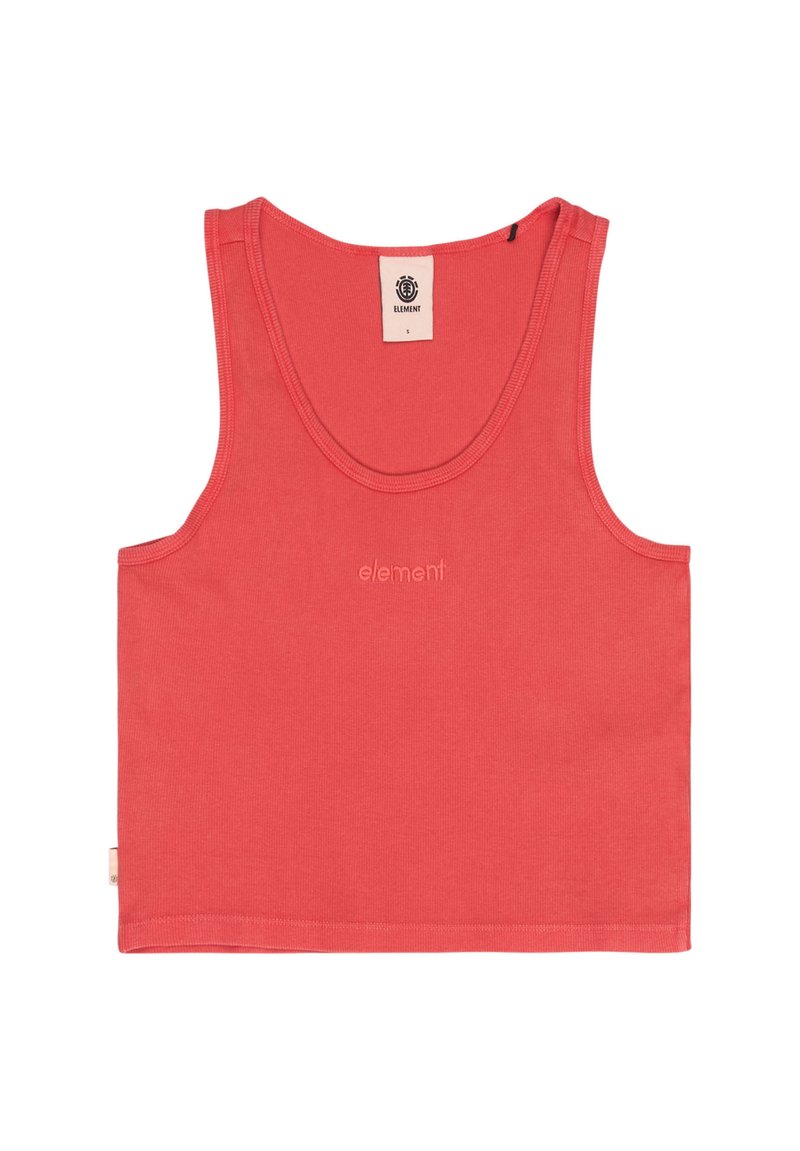 Korálovo sfarbený bezrukávový krátky top s okrúhlym výstrihom, vyšívaným nápisom "element" na prednej strane a štítkom značky Element vo vnútri goliera.