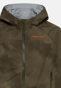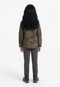 Dieťa stojace v olivovo zelenej bunde s kapucňou, tmavosivých cargo nohaviciach a zladených zelených turistických topánkach na bielom pozadí.