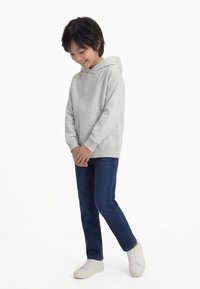 Usmievajúce sa dieťa v svetlosivom kapucňovom pulóvri, tmavomodrých džínsoch a bielych teniskách, stojace so zloženými rukami a pozerajúce sa dolu.