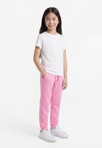 Mladá dievčina stojaca, usmievajúca sa, oblečená v bielom tričku s krátkym rukávom, ružových teplákoch a bielych teniskách, s rukami v vreckách.