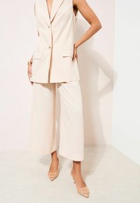 Nohy v béžových semišových sandáloch na podpätku so špicatou špičkou a veľkou štvorcovou prackou, v kombinácii s krémovými širokými nohavicami so štruktúrou.