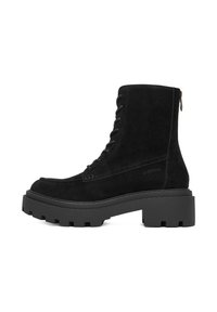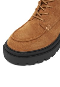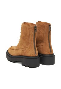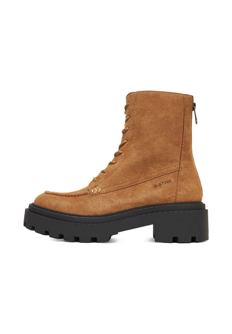 Hnedé semišové členkové topánky s hrubou čiernou gumovou podrážkou, šnurovaním vpredu a bočným zipsom pre jednoduché obúvanie. Na boku vyrazené logo G-Star.