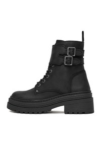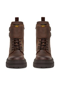 Hnedé kožené členkové topánky s okrúhlou špičkou, šnurovaním vpredu a dvojitými remienkami s prackou. Robustná podrážka s textúrou a miernym podpätkom.