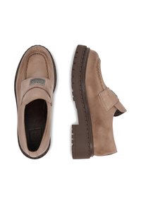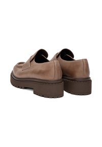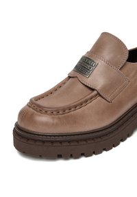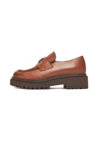 Hnedá kožená mokasína s robustnou podrážkou, prešitým zvrškom a ozdobným remienkom cez prednú časť na bielom pozadí.