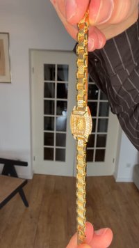 Zlatý náramkový hodinový stroj s štvorcovým ciferníkom, akcentmi podobnými diamantom a prepojeným páskom. Nosí sa na zápästí, v kontraste s modrým sveterom.