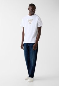 Muž v bielom tričku s krátkym rukávom so zlatým logom Guess a tmavomodrých džínsoch, stojaci pred jednoduchým svetlým pozadím.