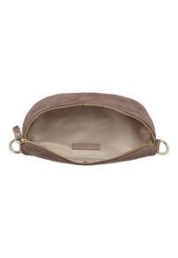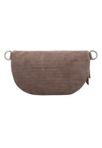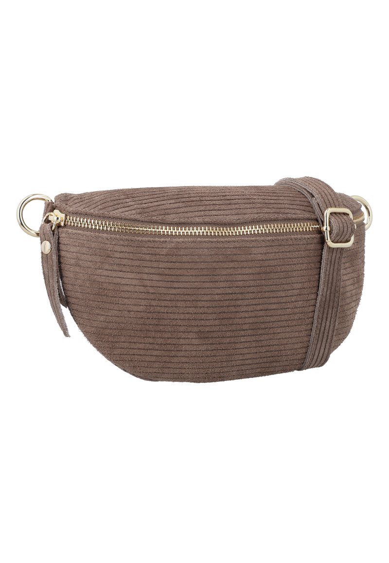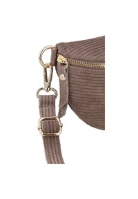 Hnedá rebrovaná tkanina pásová taška so zlatým zipsom a nastaviteľným popruhom s prackou na bielom pozadí.
