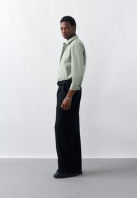 Mladý muž hľadiaci doľava, oblečený v svetlozelenú košeľu na gombíky cez čierny top, čierne nohavice s opaskom a so strieborným reťazovým náhrdelníkom a náramkom.