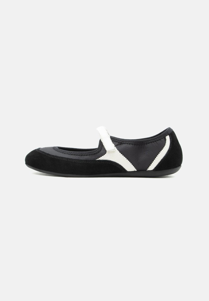 Čierna plochá obuv Mary Jane s bielym remienkom a bielymi doplnkami, elastickým lemom a tenkou podrážkou, zobrazená z boku na sivom pozadí.