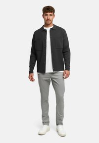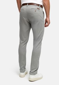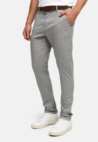 Muž oblečený v svetlosivých úzkych nohaviciach s hnedým koženým opaskom a bielymi teniskami stojí pred jednoduchým pozadím.