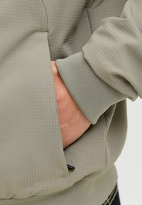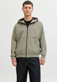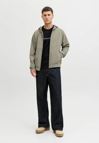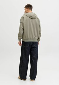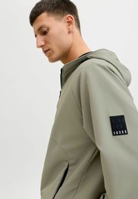 Mladý muž stojaci, oblečený v svetlosivej zipsovej mikine s kapucňou a tmavých džínsach na jednofarebnom pozadí.